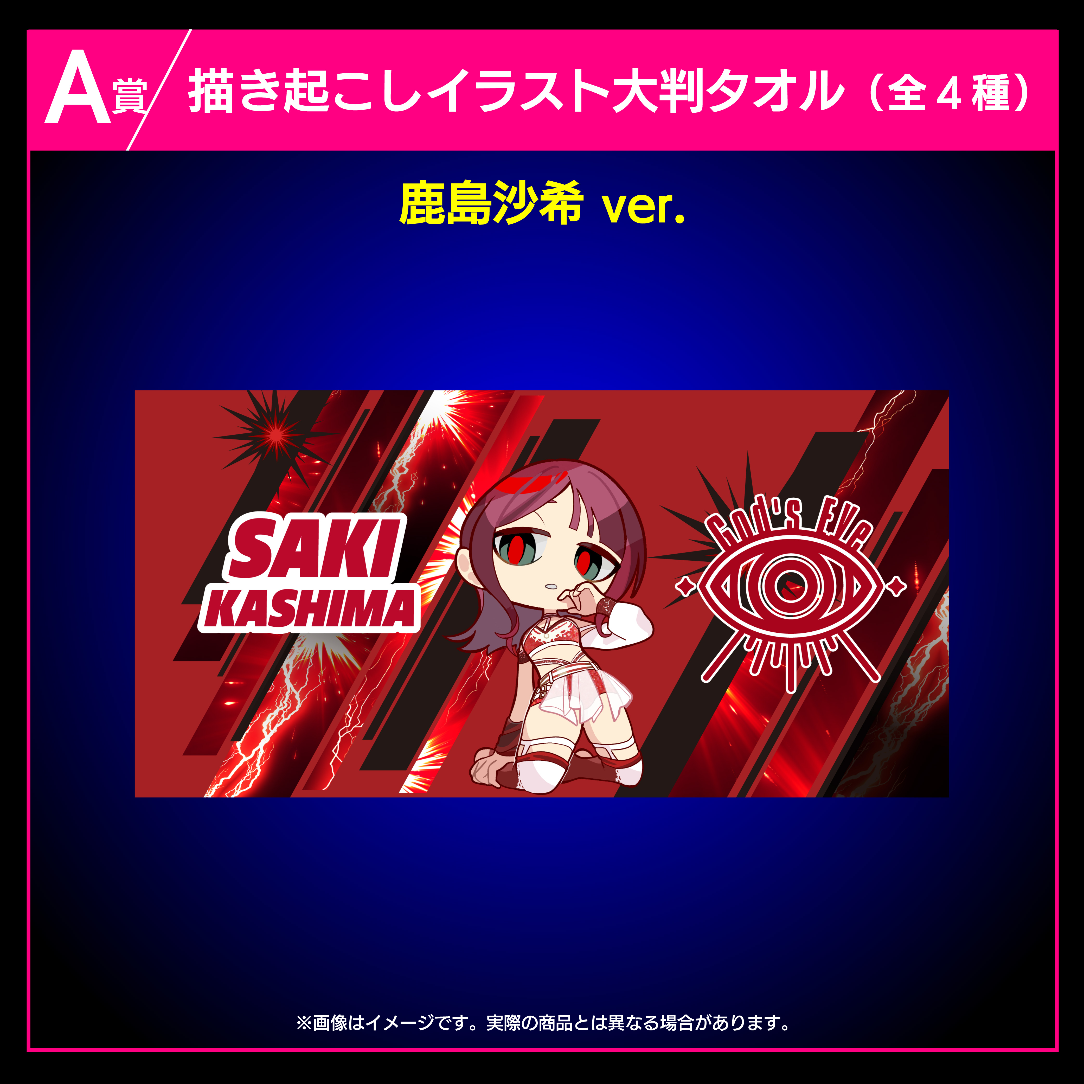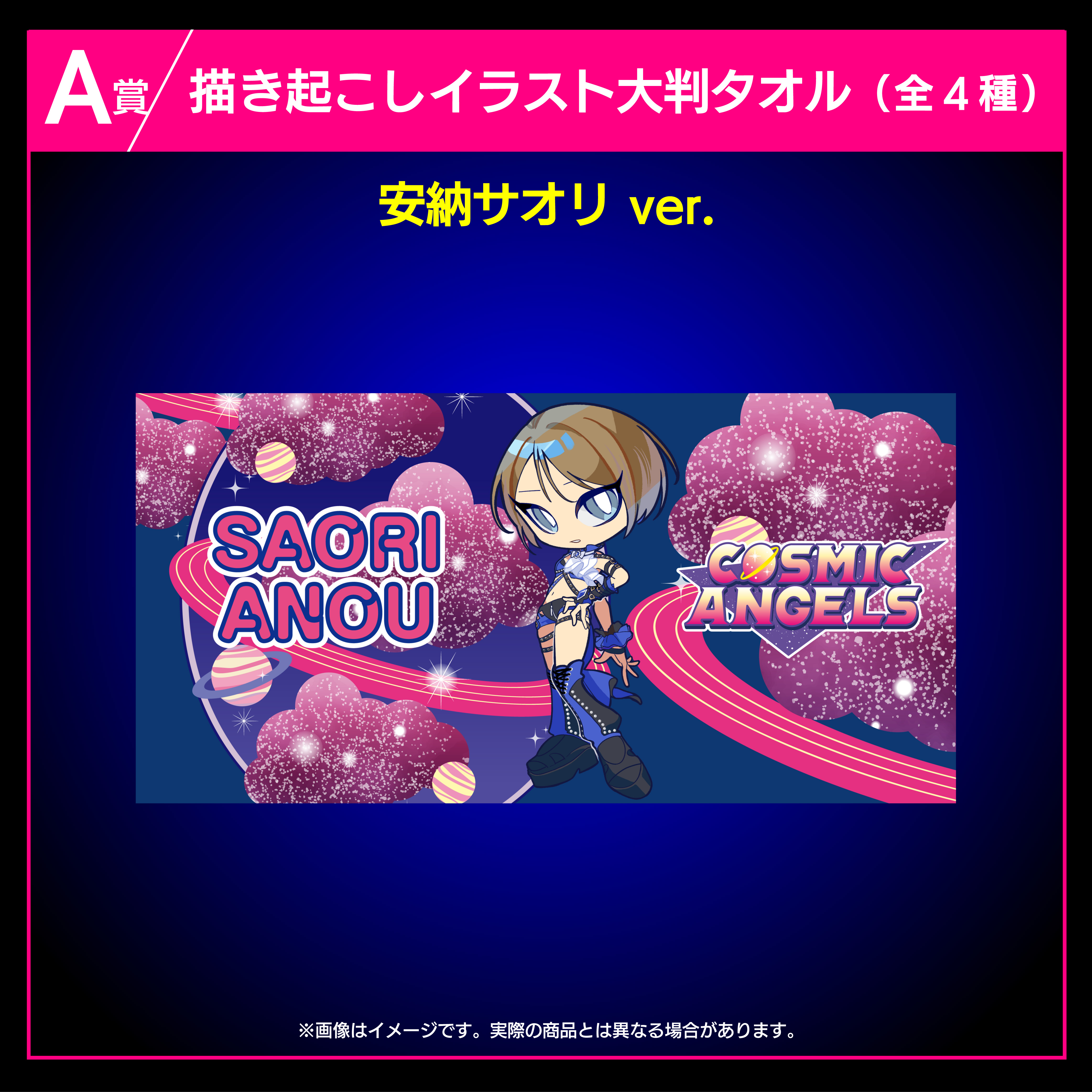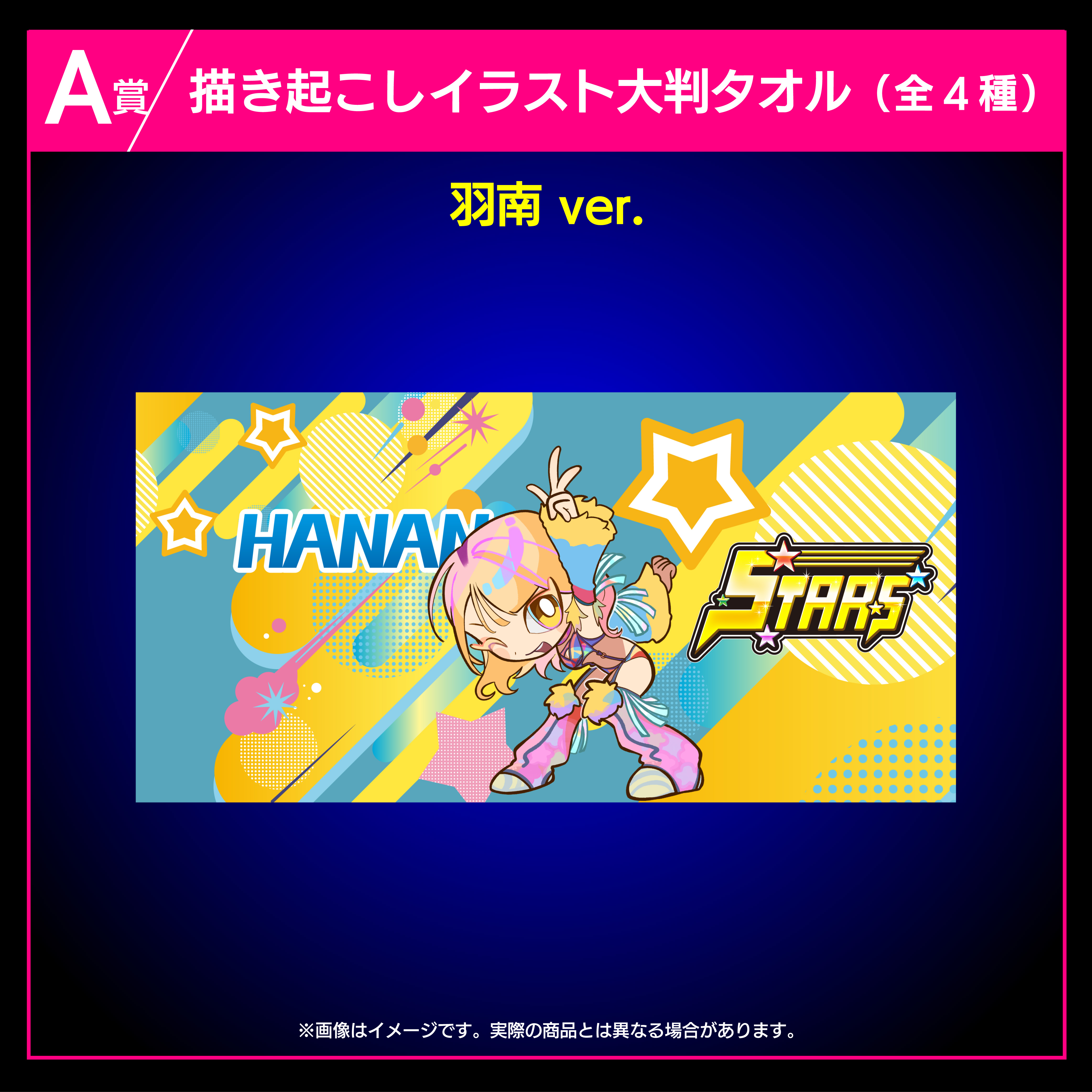 羽南、安納サオリ、鹿島沙希、スタ―ライト・キッドの4選手の描き起こしイラストを使用した大判タオルです。