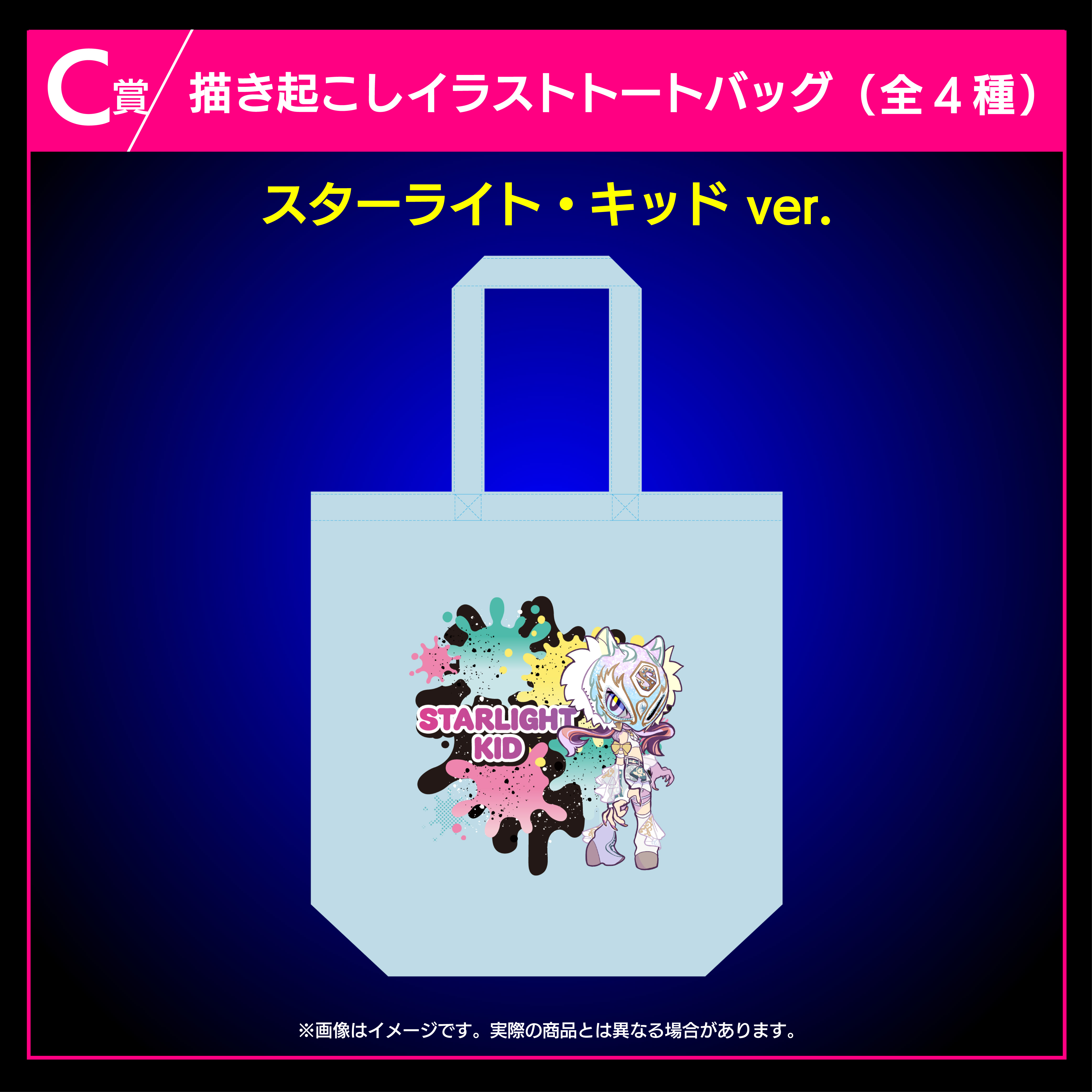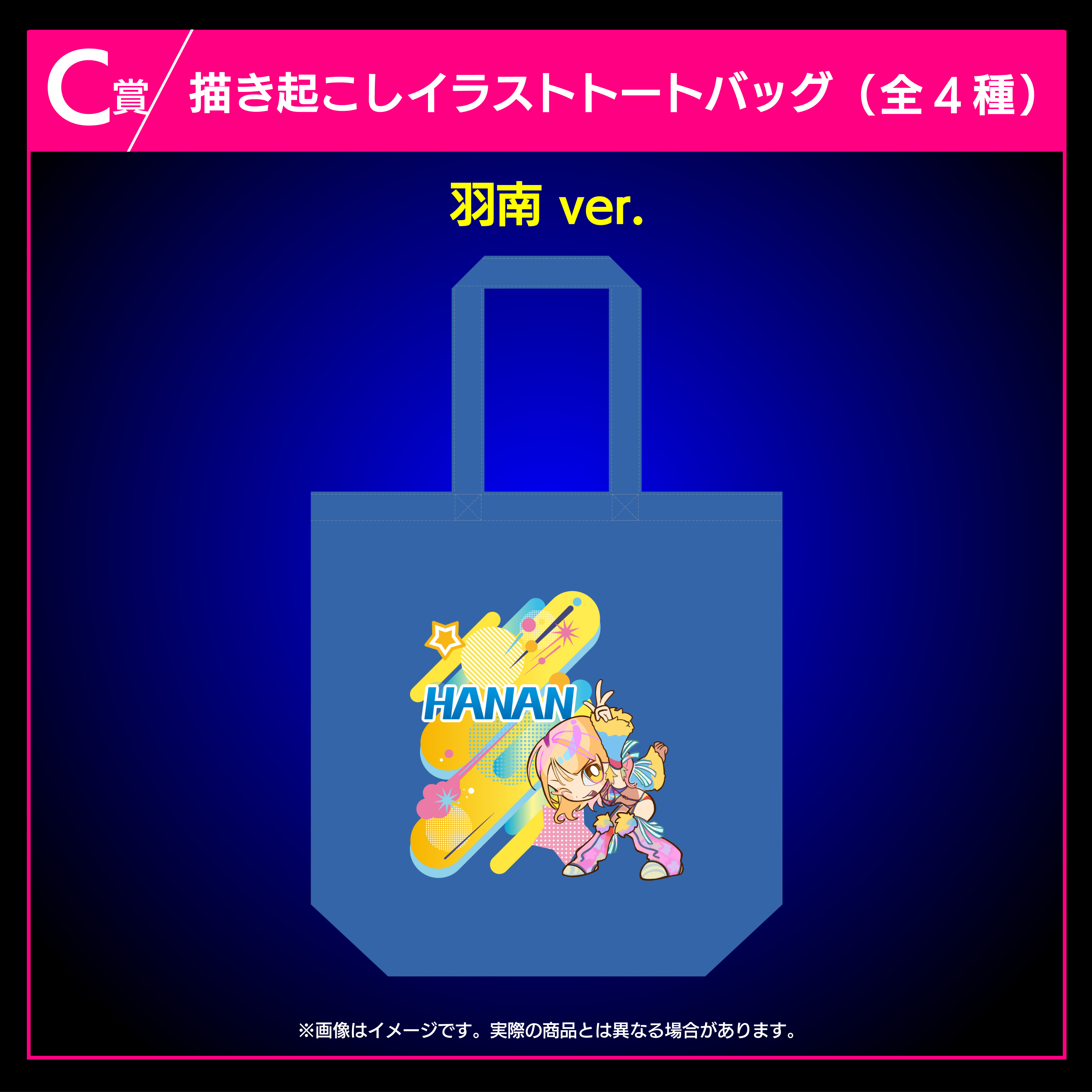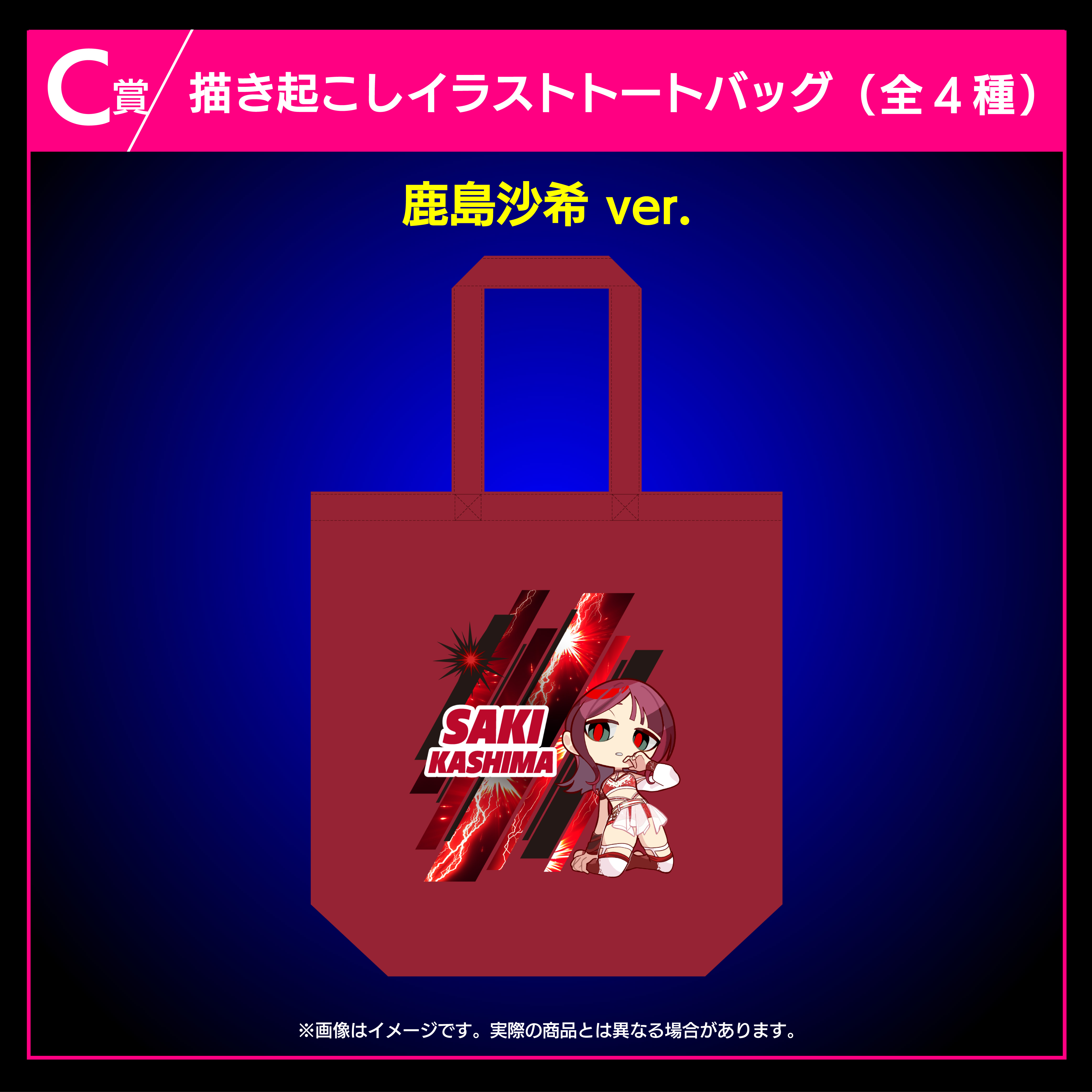 羽南、安納サオリ、鹿島沙希、スタ―ライト・キッドの4選手の描き起こしイラストを使用したトートバッグです。