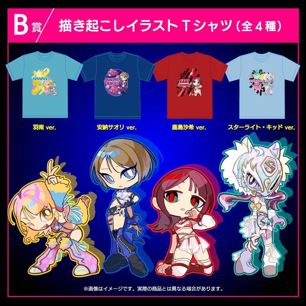羽南、安納サオリ、鹿島沙希、スタ―ライト・キッドの4選手の描き起こしイラストを使用したTシャツです。